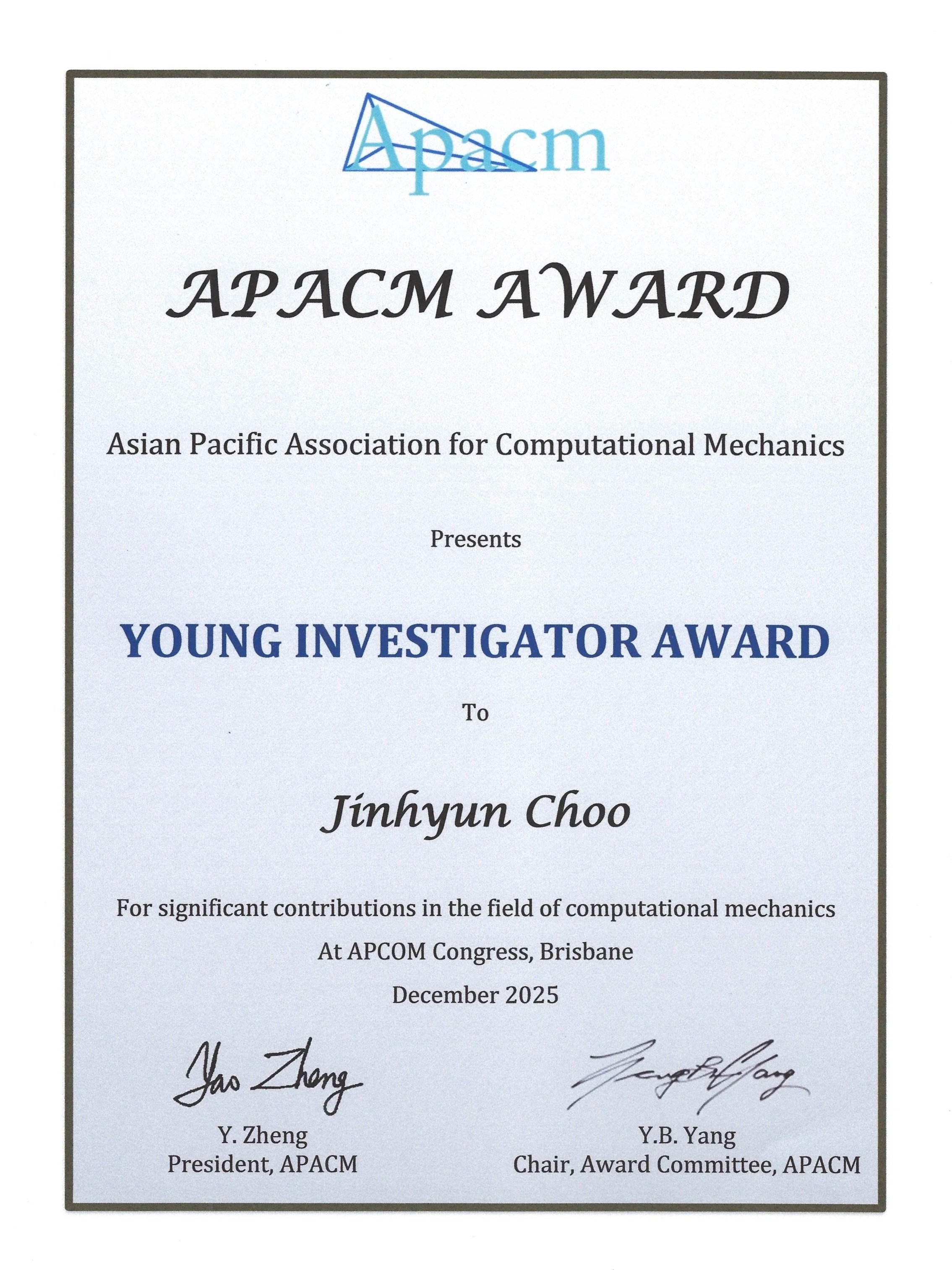 Jinhyun has received the APACM Young Investigator Award from the Asian Pacific Association for Computational Mechanics (APACM). The award ceremony was held on December 8, 2025, during the APCOM–ACCM 2025 Conference in Brisbane, Australia.