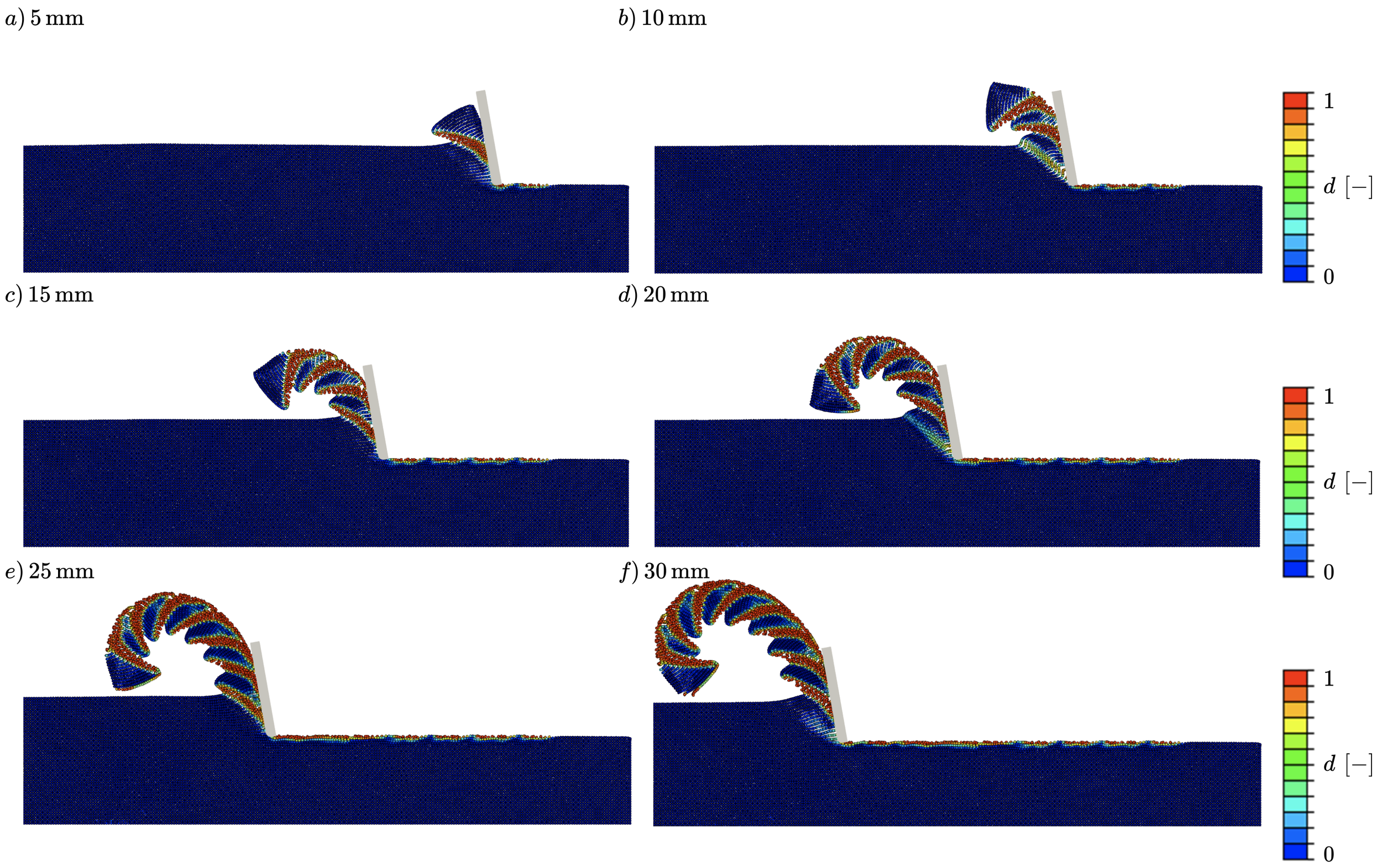 Abstract: Reliable prediction of mechanical interactions with hard-packed snow requires constitutive models that capture coupled plasticity, damage, healing, and large deformation. Current constitutive formulations for snow typically neglect either damage-induced degradation or stiffness recovery (healing), particularly under finite-strain conditions relevant to high-speed interactions such as tire-snow contact. While continuum damage-healing models exist for materials such as concrete, asphalt, and polymers, their direct application to snow is hindered by snow’s distinct rapid mechanical degradation and healing behaviour. In this contribution, a finite-strain constitutive model is proposed for hard-packed snow, incorporating both damage and healing effects. The elastic response is described by a Neo-Hookean constitutive law, while plastic deformation is governed by a cohesive extension of Modified Cam-Clay plasticity augmented with exponential hardening. Damage evolution is driven by deviatoric plastic deformation, whereas healing is activated by compressive volumetric plastic deformation. The finite element method (FEM) is used, and mesh objectivity is maintained through a non-local regularization approach. Model parameters are calibrated using numerical triaxial and uniaxial tests. Predictive capability is demonstrated through a blade-cutting simulation using a B-spline material point method (MPM) combined with a level-set contact algorithm. The proposed model successfully captures the interplay between shear-induced damage and compression-induced healing, providing a consistent framework for predictive assessment and optimization of winter tire performance.